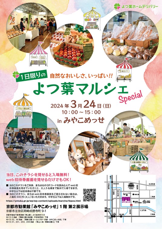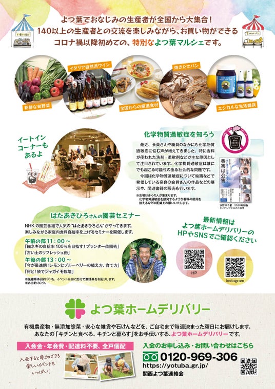 オーガニックや化学合成添加物不使用など、美味しくて信頼できる食べもの、安全な生活雑貨をお届けして約50年。よつ葉ホームデリバリーの生産者が全国から大集合。130以上の生産者との交流を楽しみながら、お買い物ができる、京都では初めての特別なよつ葉マルシェです。
