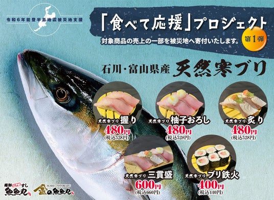 「食べて応援」プロジェクト第一弾は、1月18日(木)から2月14日(水)までの期間、当社が運営するグルメ回転寿司「魚魚丸(ととまる)」の全店舗で実施されました。この期間中、石川・富山県産天然寒ブリを使用した5品目が対象商品となり、計9万298皿を販売。その売上の一部を被災地支援の義援金として寄付いたしました。