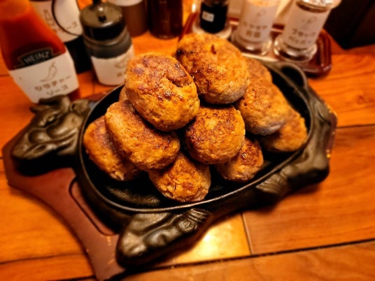 1個は約100g、一人平均は8個ほど。最高はなんと16個。おかわりは1回に3個づつ提供、ライスやカレー・サラダ等を取り放題。生卵1個サービスで半熟目玉焼きや卵かけご飯も楽しめる。