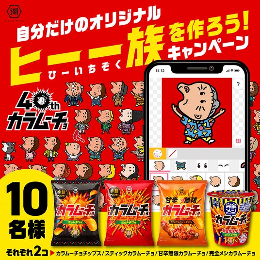 「カラムーチョ」は1984年の発売以来、独自の“辛さとおいしさ”で多くのお客様よりご愛顧いただいています。2024年2月12日(月)には、日清食品株式会社が展開する「完全メシ」シリーズでは初となるスナック菓子「完全メシ カラムーチョ ホットチリ味」を全国・全チャネルで販売開始するなど、“現代の若者が熱狂する気分転換スナック”をコンセプトに、今なお進化を続けています。2月26日(月)から放映が始まる、ブランド40周年を記念した「完全メシ カラムーチョ」の新TVCMでは、「カラムーチョ」のキャラクターである「ヒーおばあちゃん」をはじめとした、“ヒー 一族(ヒーいちぞく)”が登場します。今回のキャンペーンでは、あなたの“オリジナルヒー 一族”を作成し、X(旧Twitter)で投稿していただくと応募完了。ぜひあなただけの“ヒー 一族”を作成していただくとともに、「カラムーチョ」各種が当たるキャンペーンにご参加ください。