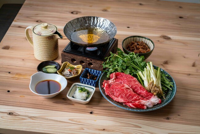 明治時代より生産される群馬を代表するブランド牛。口に入れた瞬間とろけるような食感が魅力の上州牛リブロースと、さわやかな香りでしゃきっとした食感の春せりを、自家製醤油糀ぽん酢で。