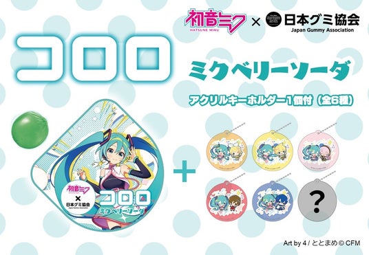 「コロロ ミクベリーソーダ」はアクリルキーホルダー付きの豪華版も販売。イラストレーターのととまめさん 描きおろしのかわいいミニキャラのピアプロキャラクターズがグミニケーションしています。