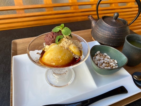 もっちり食感のくず餅プリンに北海道産の大納言あずき餡を添えて和プリンに仕上げました。くず餅乳酸菌入りのとろ~りとした黒蜜と香ばしいきな粉、さらに無糖の玄米パフを絡めることで”フワッとサクッ”とした香ばしさが加わり、口に運ぶごとに様々な表情をお楽しみいただけます。またドリンクセットなのでお好みのドリンクをお選びいただけます。(写真は屋久島無農薬二番茶です。)