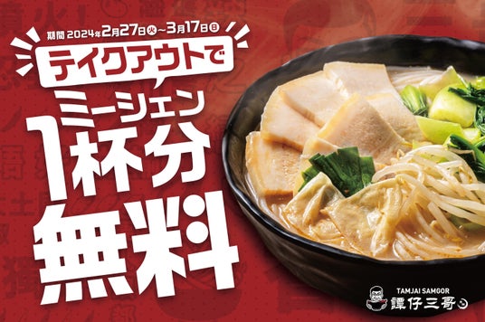 食の感動体験を提供する、株式会社トリドールホールディングス(東京都渋谷区、代表取締役社長兼CEO粟田貴也、以下、トリドールHD)の傘下グループ企業である「株式会社譚仔日本」は、テイクアウトサービス「O:der ToGo」でミーシェンをご注文された方に、次回以降ご使用いただける「ミーシェン1杯無料券」を提供するキャンペーンを、2024年2月27日(火)から3月17日(日)までの期間限定で実施いたします。