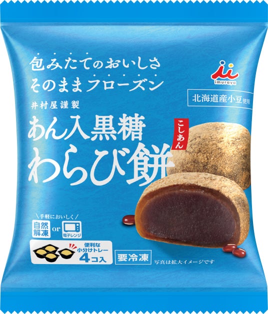 リニューアルポイント:こしあんの原料を北海道産小豆にリニューアルしました。また、生地に使用する沖縄県産黒糖を増量し、ぷるんとした食感はそのままに、より黒糖の風味を楽しめる生地に仕上げました。なめらかな井村屋謹製のこしあんと、黒糖の風味がしっかりと感じられるわらびもちの生地を、バランスよく楽しめます。