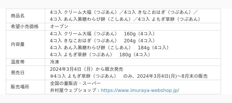●「冷凍和菓子4コ入シリーズ」:https://imuraya-cp.jp/reito_wagashi/