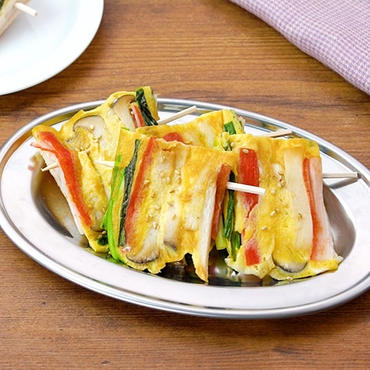 コチジョンとは、具材を串に刺して卵をくぐらせて焼いた、韓国のお祝いなどでも食べられる料理で、コチは「串」、ジョンは「チヂミ」を意味します。今回は手に入りやすく少ない食材で作りやすくアレンジしました。串に刺さっていて手を汚さず食べられるので、行楽弁当などにもおすすめ♪カラフルで目をひく、もう1品ほしいときにぴったりのおかずです。