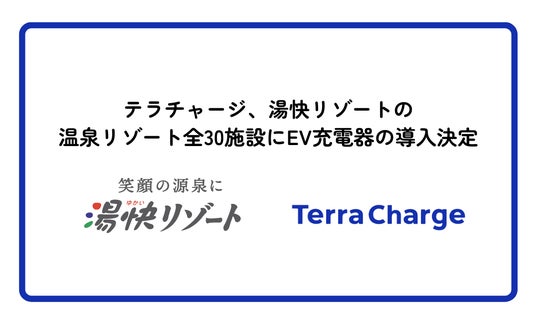 EV充電インフラ事業「Terra Charge(テラチャージ)」を展開するTerra Charge 株式会社(本社:東京都港区、代表取締役社長:徳重徹、以下「当社」)は、湯快リゾート株式会社(本社:京都府京都市、代表取締役社長:西谷浩司、以下「湯快リゾート」)と業務提携し、湯快リゾートが運営する温泉旅館・リゾートホテルの全30施設に、EV充電「Terra Charge」を導入することが決定したことをお知らせいたします。