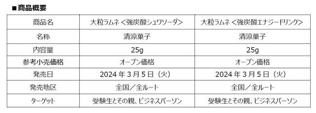 本商品は、通常の「大粒ラムネ」よりも強烈なシュワシュワ感と突き抜ける味わいが特長です。仕事や勉強で集中したい時やリフレッシュしたい時にぴったりの本商品の発売により、頑張る受験生やビジネスパーソンを応援してまいります。