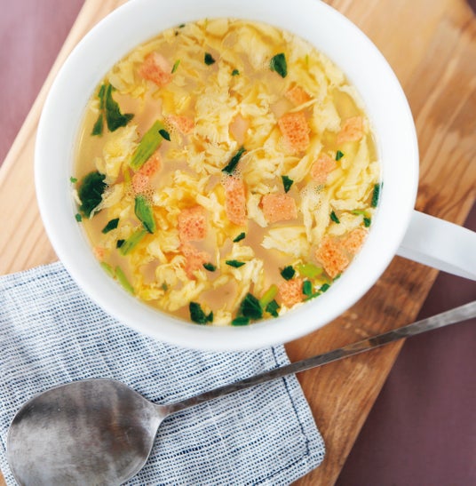 お湯を注ぐだけで完成する、ふわふわ玉子が入ったチキンベースのスープで、
