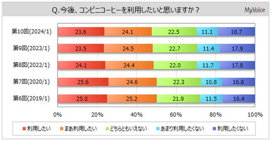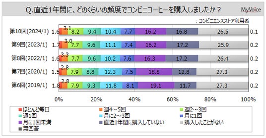 マイボイスコム株式会社(東京都千代田区、代表取締役社長:高井和久)は、10回目となる『コンビニコーヒー』に関するインターネット調査を2024年1月1日~5日に実施しました。コンビニコーヒーの利用状況や意向、普段飲むコーヒーなどについて聞いています。