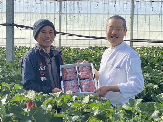 渥美半島観光ビューロの方から、豊川市・蒲郡市とともに主催する「ストロベリーロード 苺一会 ドライブスタンプラリー」の企画をご紹介いただき、ホテルアソシア豊橋も参画いたしました。その際にホテルで行われた記者商品発表会で、参加飲食店や生産農家の話を聞き、製菓料理長 古田が「温泉水を栽培に使うことで糖度が上がるいちご」に注目しました。(株)マーコを訪問し、マーコさんの美味しいいちごを届けるための思いや、いちご栽培のこだわりなどを詳しくお伺いし、「いちごのしあわせ」本来の素材の味を活かしたオリジナルスイーツを作りたいという古田の強い思いがコラボのきっかけとなりました。