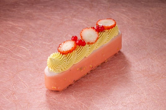 ルビーショコラムースの中に、酸味のあるいちごゼリーとバニラババロアを入れて甘酸っぱいケーキに仕上げました。たっぷり絞ったピスタチオクリームと、刻んだピスタチオをアクセントに。