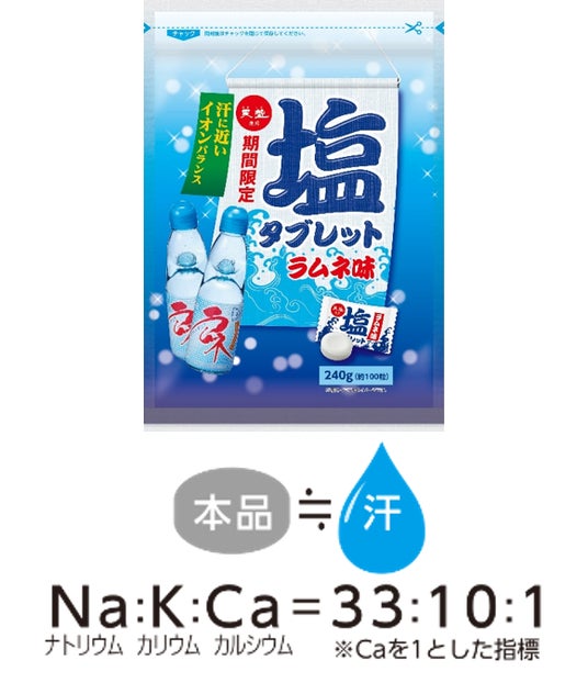 この背景を受け株式会社天塩は、住居や仕事場におけ暑さ対策として既存商品「塩タブレットラムネ味」から240g入りの業務用サイズを3月1日(金)に発売開始します。たっぷり240g入った大容量パッケージは、ご自宅や職場に常備しておくだけで、いつでも気軽に暑さ対策ができるアイテムとしておすすめの商品です。
