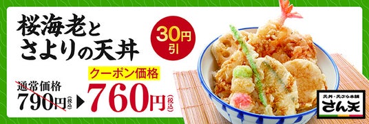 「天丼・天ぷら本舗 さん天」公式アプリでは、販売期間中に使える「桜海老とさよりフェア 30円引きクーポン」を配信いたします。会員の方限定でご利用いただけるクーポンですので、この機会にぜひ「天丼・天ぷら本舗 さん天」公式アプリをダウンロード&会員登録ください。