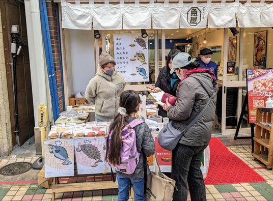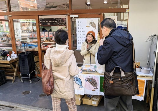 商品開発ストーリーや海の課題を来店客へ伝えるスタッフ(sakana bacca中延)