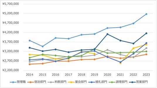 ホテル求人ドットコムの採用時の職種を「管理職」「宿泊部門」「料飲部門」「宴会部門」「婚礼部門」「調理部門」「営業部門」でカテゴライズして分析しました。目に留まるはGMや支配人、料理長などの管理職の採用時給与の成長率と、いわゆる現場スタッフの給与の成長率の差に驚かされます。また、新型コロナウイルス感染症パンデミック以降の優秀な営業スタッフの雇用提示額が他の部門より特異な成長をしています。営業スタッフに求められる能力も近年のデジタル化によるレベニューマネジメント能力等、従前の営業スタイルとは異なった能力を求められていることが背景にあると推測します。