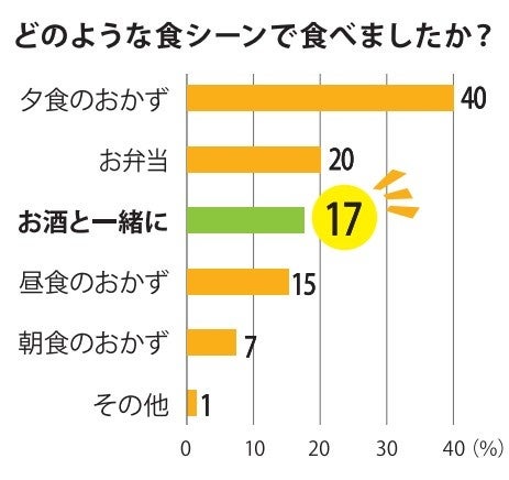 濃厚なイカの味が里芋にしみた「イカと里芋の煮物」。旨味がたっぷりでもっちりとした食感の“あの”里芋をいつでも食べられるようにしたいと、この商品は生まれました。味付けにはイカペーストを使用し、もっちりとした食感の里芋を選んで使用することで、“イカは入っていない”のに「濃厚なイカの味が染み込んだ」里芋に仕上げています。クセになる味付けで、おかずのもう1品としてはもちろん、お酒のお供にも使っていただきやすい商品です。温めるとイカの香りが広がり、さらにおいしくお召し上がりいただけます。事前にマルヤナギが行ったモニター調査では、95%が「味が良い」と評価し、食シーンとしては夕食のおかずやお弁当に続き「お酒と一緒に」食べるが選ばれました。(データ:マルヤナギ調べn=46)