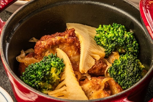 SOYミートとお野菜の肉じゃが 高タンパク&低脂質な大豆ミートを使用。春野菜のたけのこや、ブロッコリーを加えた具だくさんな肉じゃが。