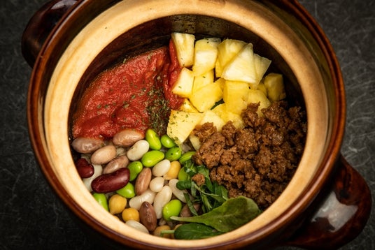 野菜が主役の羽釜ご飯 パイナップル、ミックスビーンズ、大豆ミートそぼろ、ベビーリーフ、トマトソースと色鮮やかな主役ご飯。
