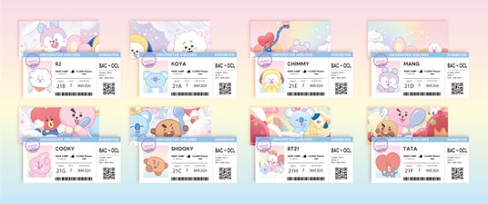メニューを1品お買い上げ毎に「On the Cloud」のストーリーにちなんだ「BT21 UNIVERSTAR AIRLINES ボーディングパスカード(全8種)」を1枚プレゼント(ランダムでお渡し。なくなり次第終了。)