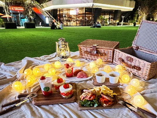 『Park Sotuth Sandwich FUKUOKA』のもう一つの客席である福岡大名ガーデンシティ内の緑豊かなガーデンで、情緒的なナイトピクニックをお楽しみください。
