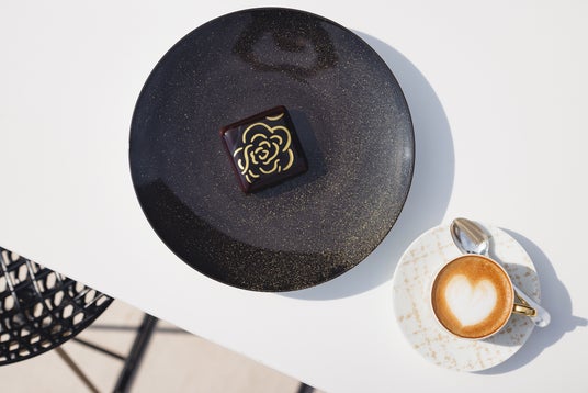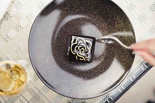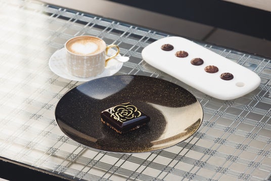 「ベージュ アラン・デュカス 東京」のシグネチャー「カレ・シャネル」とドリンクのセット。ゴールドのカメリアが描かれた真っ黒な正方形のショコラムースの中には、ショコラビスキュイ、塩キャラメル、プラリネクリーム、ショコラガナッシュやカカオニブと蕎麦の実を使ったフィアンティーヌなどが層となり、食べ進めるごとに様々な食感や味わいを堪能できます。