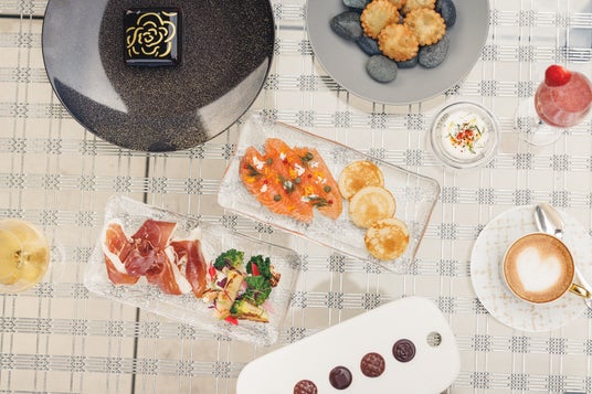 銀座の街を見下ろす開放感あふれる空間で楽しめるティータイムセットでは、同じビルで展開する二つ星フレンチレストラン「ベージュ アラン・デュカス 東京」のコース限定でしか味わえなかったシグネチャーデザート「カレ・シャネル」が登場!カメリア、マトラッセなどをモチーフにしたショコラやコーヒー、紅茶、ハーブティーなどと共に堪能いただけます。そのほか、「イベリコ豚の生ハム」「サーモンのブリーニ風」をはじめとするフィンガーフード、ココ・シャネルをイメージしたカクテルなどをご用意します。