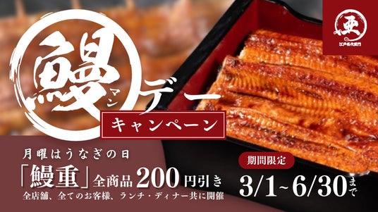 高級店と同じニホンウナギを手頃な価格で食べられる「うなぎ屋 江戸名代亜門」を展開する株式会社亜門(所在地:東京都港区/代表取締役:甲田めぐみ)は、毎週月曜日に鰻重全商品を200円引きで提供する『月曜日はうなぎの日! 鰻デー』キャンペーンを3月4日(月)~6月24日(月)の期間おこないます。