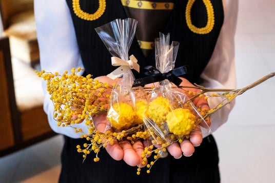セントレジスの創業者の母であり、19世紀後半にニューヨークに初めて社交界を築き上げたキャロライン・アスターは、当時の上流社会の女性リーダーとして羨望を集める存在でした。大胆で美しく、洗練された生き方を追求したアスター夫人のおもてなしの心やセレブレーションの精神を受け継ぎ、セント レジス ホテル 大阪で開催する「ミモザウィーク」では、太陽をイメージした明るく開放感のある12階のロビーに、国際女性デーのシンボルであり「感謝」の花言葉を持つミモザの花を飾り、ゲストの皆様を華やかにお迎えいたします。3月8日(金)は、春の訪れを感じさせる鮮やかな黄色いミモザの花をイメージした、ペストリーシェフ特製のパッションフルーツが甘く香るクランチチョコレートを、チェックインの際に女性のお客様にお渡しします。