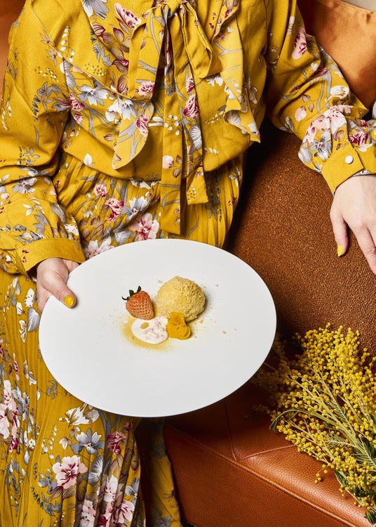 また、3月1日(金)~31日(日)の期間は、ディナーコース「スタジオーネ」、そしてオプションでお選びいただけるランチコースのデザートとして、苺とマスカルポーネ、カスタードを求肥で包み、ココナッツミルクのまろやかなソースを添えた、ふわりと咲くミモザの花をイメージした華やかなドルチェ「トルタ ミモザ」をご用意します。