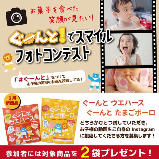 オンライン試食会に続き、当社のInstagramでは2月7日から「ぐーんと!でスマイルムービーコンテスト」、2月22日から「ぐーんと!でスマイルフォトコンテスト」を開催中です。Xでは、パッケージに描かれた動物たちのキャラクターの名前の公募企画も予定しています。SNSを通じて、幅広い世代の骨の健康を応援をしていきます。