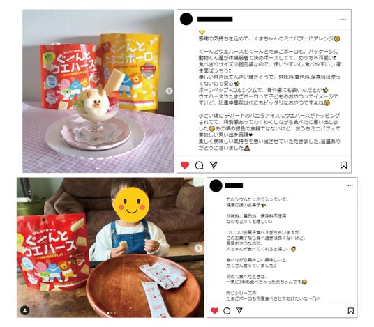 発売前に、当社のInstagram公式アカウントで開催したオンライン試食会(モニター)では、高評価を獲得。「カルシウムとボーンペップが入っているので大きくなって欲しい」や「甘味料、着色料、保存料不使用で安心」、「自然な甘み食べやすい」などの口コミがありました。また、個包装になっているので衛生的、毎日少しづつ食べられるといった利便性も評価されました。
