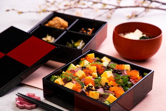 毎月シーズナルな料理を提供するランチマンスリーメニュー。3月限定ランチに「蔵王牛のローストビーフちらし重」がお目見え。黒毛和牛の脂の旨さと、野性味溢れる赤身肉の旨さを合わせ持つ蔵王牛をローストビーフに仕立て、とびこや玉子、胡瓜とともにぎっしり詰め込んだ見た目も華やかな特製ちらし寿司です。ちらし寿司の上段には「鶏のから揚げ」「ひじきの煮物」「小松菜のお浸し」「香の物」などヘルシーな和のおかずを詰めました。門出を祝う機会が多いこの時期に、大切な方とぜひ豪華絢爛ちらし重をお愉しみください。