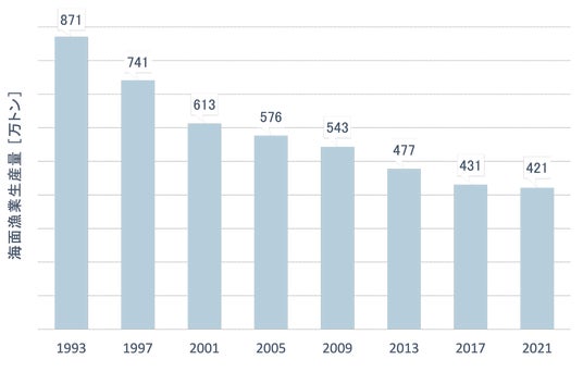 農林水産省の報告によると,近年日本の海面漁業(漁業および養殖業を含む)の生産量は過去30年で半減しています。(※1)