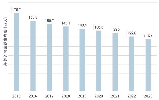 また、基幹的農業従事者数は、2015年時点の175.7万人から、2023年の推定によると約35%減の116.4万人となっています。(※2)