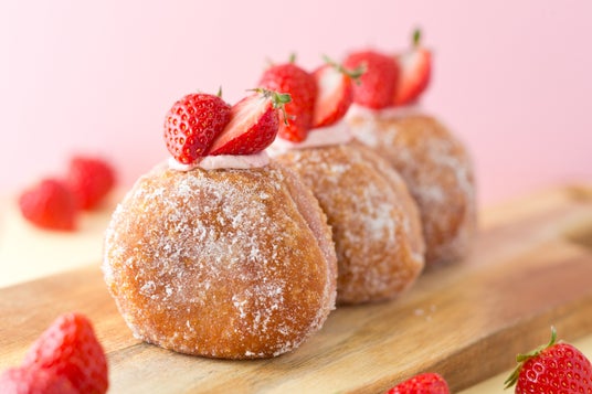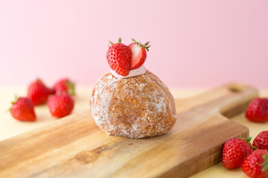 PIECE OF BAKEのふわじゅわ食感のドーナツ生地には、いちごパウダーを練り込み、中には自家製いちごクリームをたっぷり詰め込みました。さらにフレッシュな国産いちごを上に乗せ、見た目も味も華やかさを一層引き立てています。