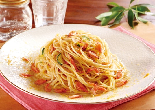 桜海老のピンクとズッキーニの緑で、見た目にも春らしいパスタは、ガーリック香る特製ソースで、風味豊かで旨みたっぷりに仕上げました。