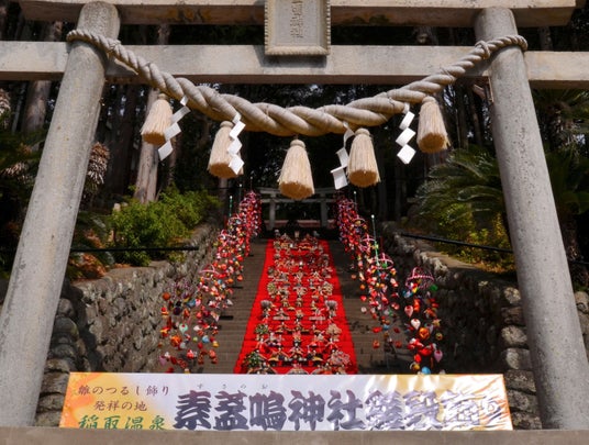 1617年創立とされる素盞鳴(すさのお)神社。稲取と海を皆見守るお雛様として、神社の118段に雛人形とつるし飾りを展示しています。屋外では日本一となる118段の雛段飾りが展示されます。本殿に向かって伸びる石段に約600体のひな人形が並び、両脇は色鮮やかな伝統のつるし飾りで彩られます。急階段に壮観な光景が広がり、訪れる人の目を楽しませてくれます。期間中、近くを走る伊豆急行線の一部列車が徐行運転し、車窓から眺めることもできます。「雛のつるし飾りまつり」の関連行事。24年は例年に比べ約2倍のつるし飾りが展示されることになりました。