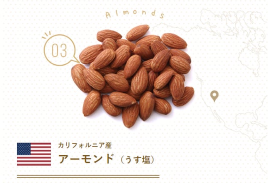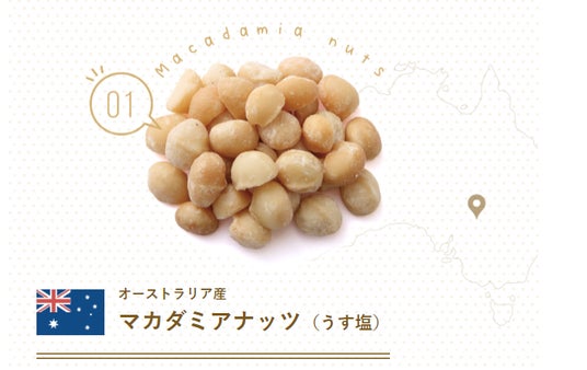 原材料:アーモンド(アメリカ産)・カシューナッツ(インド産)・クルミ(アメリカ産)・マカダミアンナッツ(オーストラリア産)・植物油・塩(えん藻昆布塩<長崎/新潟>・深海の華・クリスタル岩塩)