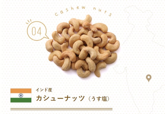 世界最大級の生産地インド産の中でも、甘みの深いカシューナッツを厳選。職人が少量ずつ手焙煎で、最大の特長である「甘み・コク・やわらかさ」を最大限引き出します。