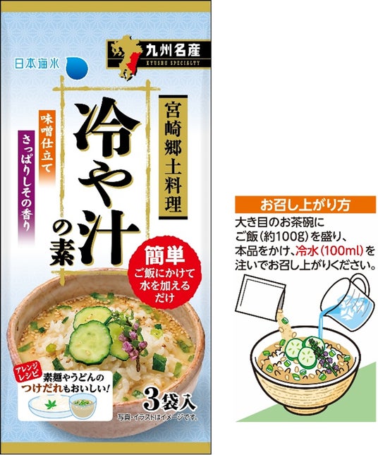 本品はご飯にかけて水を加えるだけで簡単に冷や汁ができあがります。味噌に煮干し・サバ節・ムロアジの出汁を加えた深い味わいにさっぱりとしたしその香りが、暑い日や食欲の落ちる夏場にぴったりの商品でございます。また1人前ずつの顆粒タイプで、持ち運びも便利です。うどんやそうめんのつけだれとしても使え、様々な場面でお楽しみいただけます。