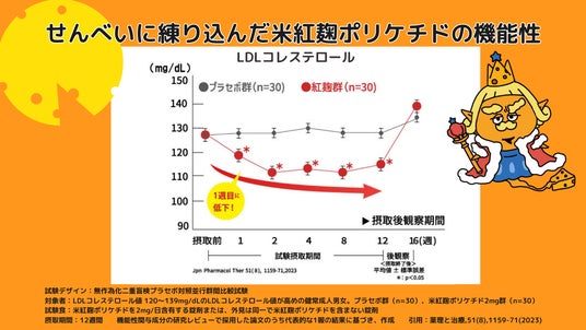 この「コメバイオ紅麹」に含まれる米紅麹ポリケチドは、機能性関与成分として悪玉コレステロールが高めの方のコレステロール値を下げることが臨床試験にて確認されています。この「コメバイオ紅?」をせんべいの生地に練り込み、機能性表示食品として消費者庁に届出を行ったのが本商品になります。