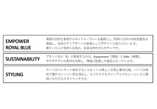 また実用的な機能性を生み出す仕立て、ディテールにまで気を配ったデザインを徹底的に追求し、ビジネスパーソンとその家族の健康に、ファッションを通して貢献できることを目指しています。