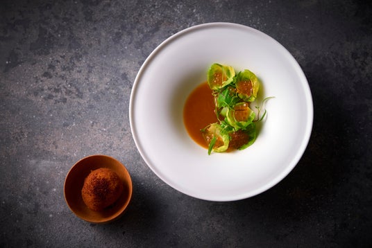 オコゼのベニエ明石産のオコゼのブイヤベースに、鎌倉の子持ち高菜と芽キャベツ、静岡県産のくぬぎ鱒の卵を組み合わせました。ふんわりと揚げたオコゼとイタリア産カラスミのベニエとお召し上がりください。