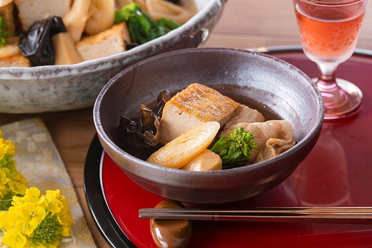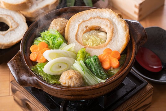「加賀麩と鶏つみれのお好み鍋」。2種類の出汁からお好みを選んで卓上で火にかけて熱々をお楽しみください。ほっとする味わいを好まれるシニアの方にも満足いただける美味しさも並びます。