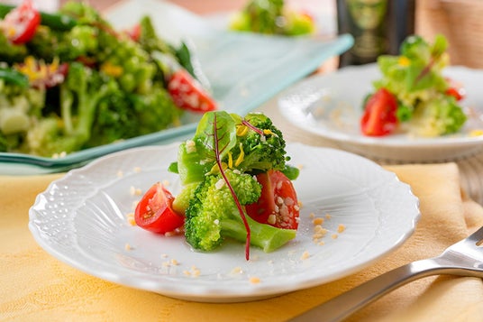 グリーンと赤の鮮やかなコントラストが見た目にも春を感じる「春野菜の和え物 パルメザン風味」。オリーブオイルとレモン汁の軽やかな味わいをお楽しみください。
