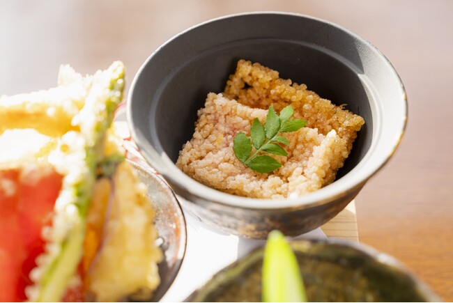 春告草と呼ばれる、春の訪れを告げる花として古くから親しまれている菜の花を使用した「菜の花と桜海老のおこげ餡掛け」もまた、春の嵐山を感じながらホッと心が落ち着く、優しい味わいをお楽しみいただけます。