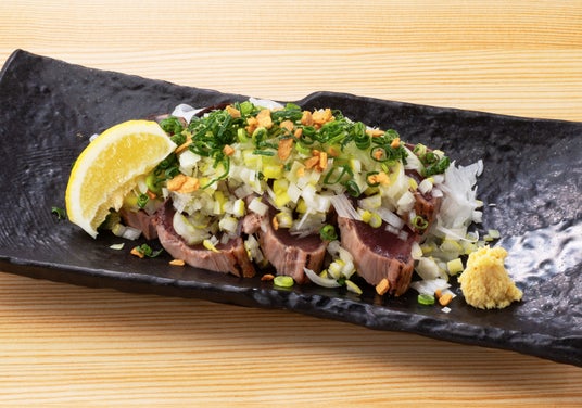 春に味わえる海の幸"春鰹"は、赤みが強くさっぱりとした味わい。どのお酒にもよく合います。たっぷりの薬味と一緒にお召し上がりください。