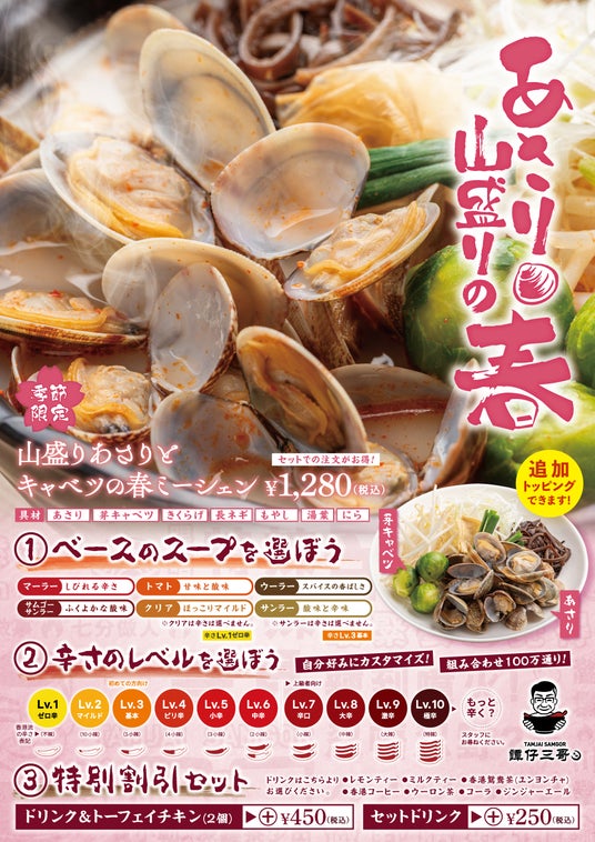 寒い冬を乗り越え間もなく訪れる春は“潮干狩り”の季節。これから産卵期を前に身入りがよくなり、あさりの旨みが増すこの季節に、タムジャイサムゴーから、旬のあさりをたっぷりと盛り込んだ季節限定メニュー「山盛りあさりとキャベツの春ミーシェン」を販売することとなりました。具材はあさり・甘味がたっぷりの芽キャベツ・きくらげ・長ネギに加え、にら・もやし・湯葉が盛り込まれており、スープはお好みに合わせて6種類からお選びいただけます。あさりの旨みとタムジャイサムゴ―のスパイスが絡み合ったスープが冬の寒さで甘味を増した旬の芽キャベツにたっぷりと染み込み、春の美味しさをご堪能いただける一杯になりました。さらに「特別割引セット」のご注文でドリンクや、一度食べたらやみつきになると人気の「トーフェイチキン」もお得にお楽しみいただけます。